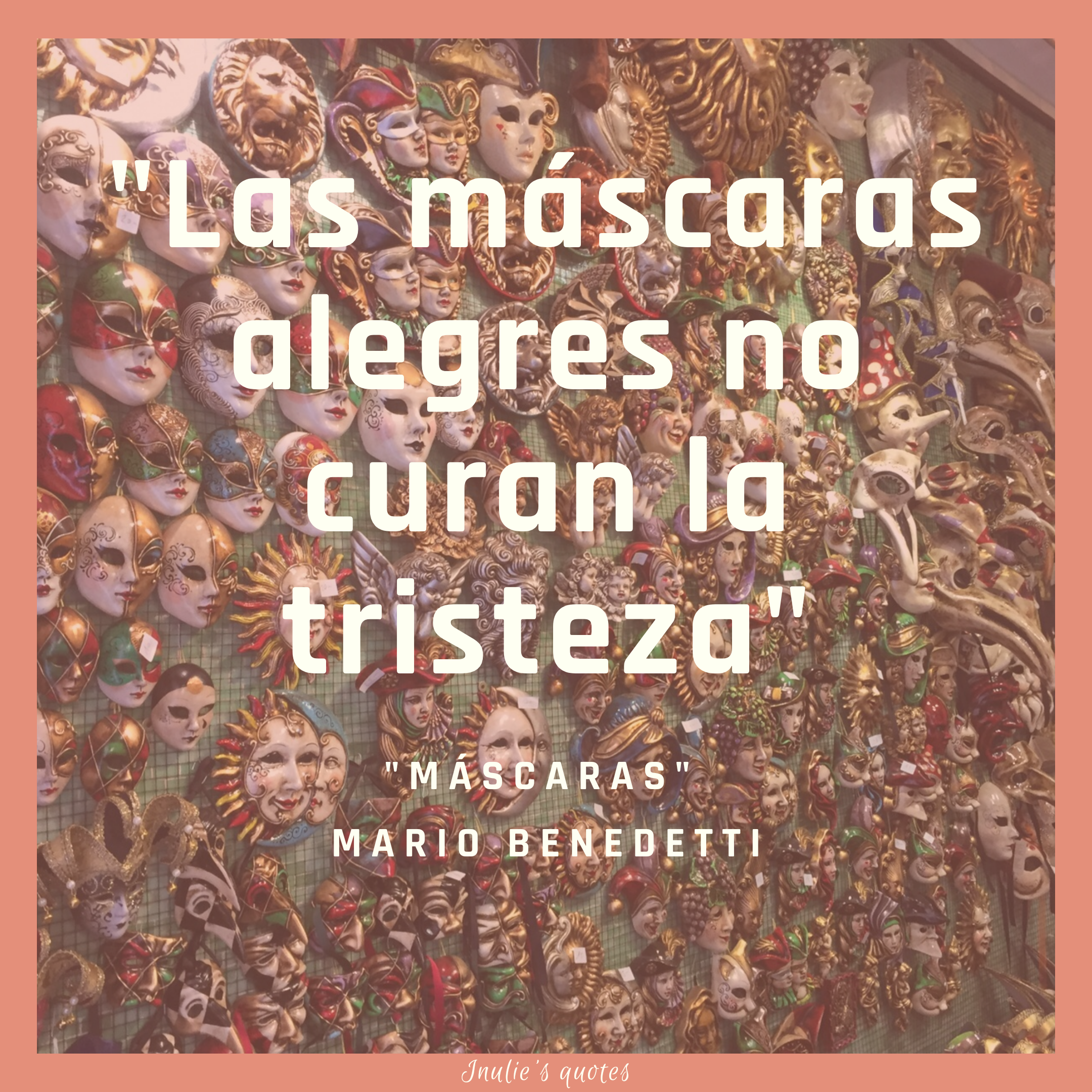 Elegí esta frase porque siempre me atrajo mucho el tema de las máscaras. En el poema él dice todas las razones por las que no le gustan, y esta es una de ellas. Su metáfora es tan profunda y tan cierta: no importa cuándo embadurnemos nuestra cara para apatentar felicidad, si la tristeza es lo que tenemos de fondo, ésta no se va. La siguiente pregunta que podríamos hacernos es por qué sentimos la necesidad de ponernos máscaras y ante quiénes lo hacemos. Creo sin duda que la máscara más peligrosa es la que intentamos ponernos ante nosotros mismos.