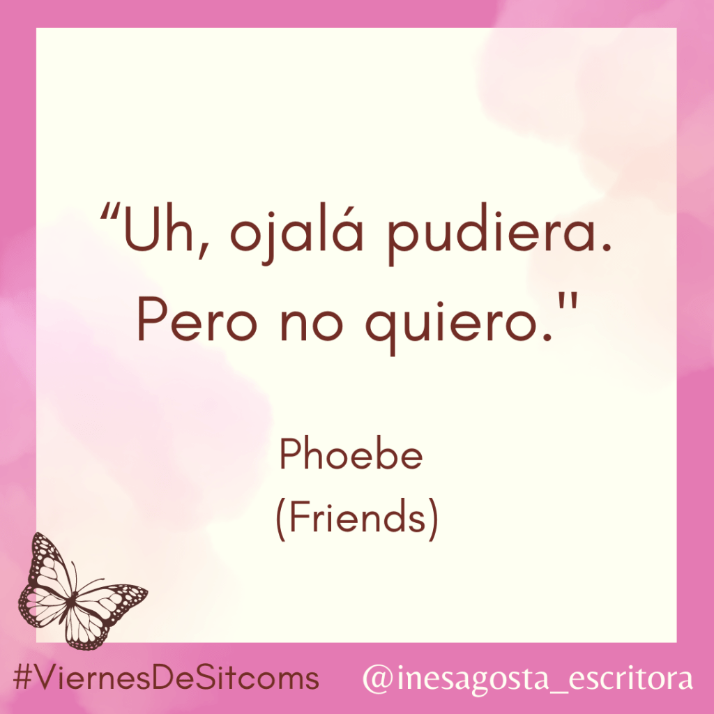 Claro que si de irreverentes hablamos, Phoebe está mandada a hacer. No todos los personajes se preocupan tan poco por lo que piensan los demás de ellos como ella. Phoebe me pone nerviosa a veces (y es que soy Mónica, no hay con qué darle) pero también la admiro por este tipo de cosas. Creo que en la vida real en vez de esta frase 100% honesta inventaríamos una excusa para no hacer lo que no queremos hacer o, como me pasa a mí el 99% de las veces, lo haría igual.